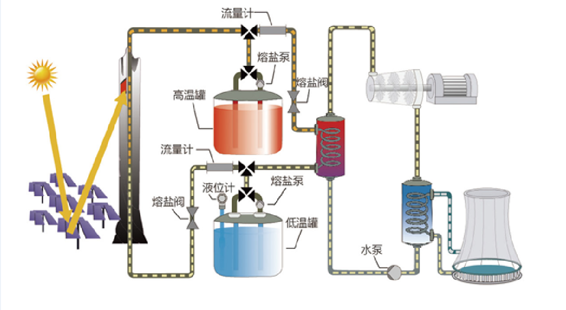 ? ?塔式熔鹽蓄熱電站利用低熔點(diǎn)儲(chǔ)能熔鹽作為工質(zhì),可以增加熔鹽儲(chǔ)能密度、減少熔鹽罐體積及降低運(yùn)行費(fèi)用。